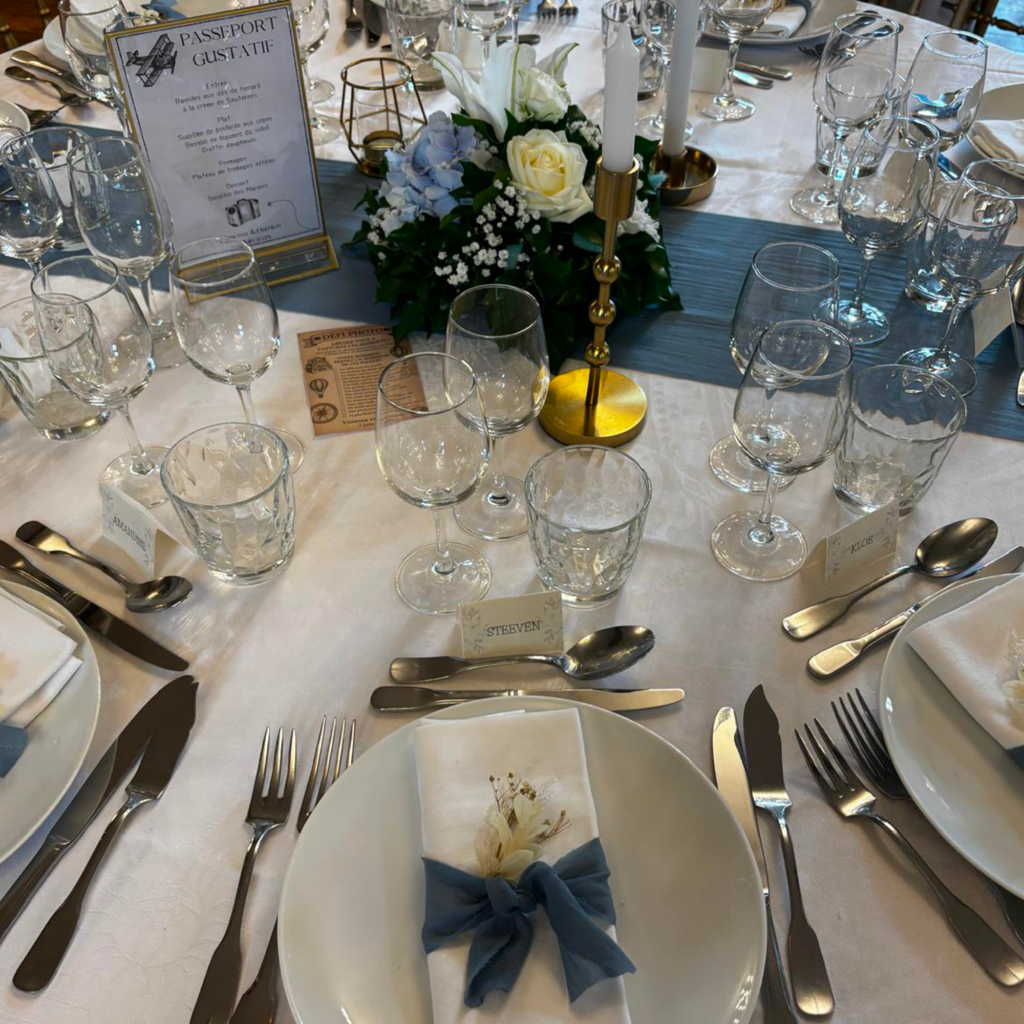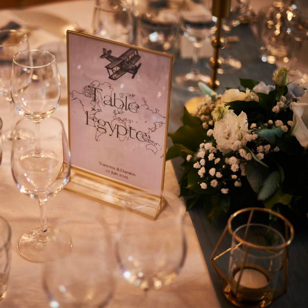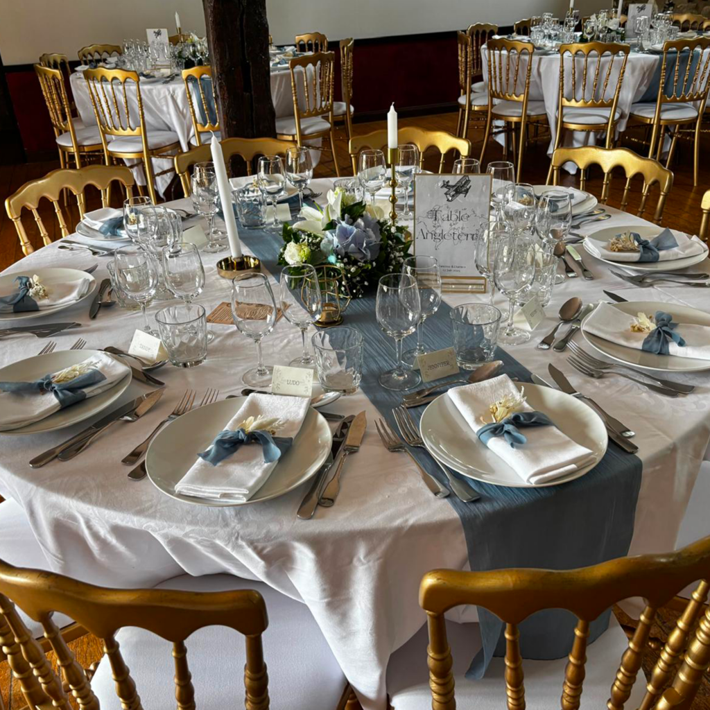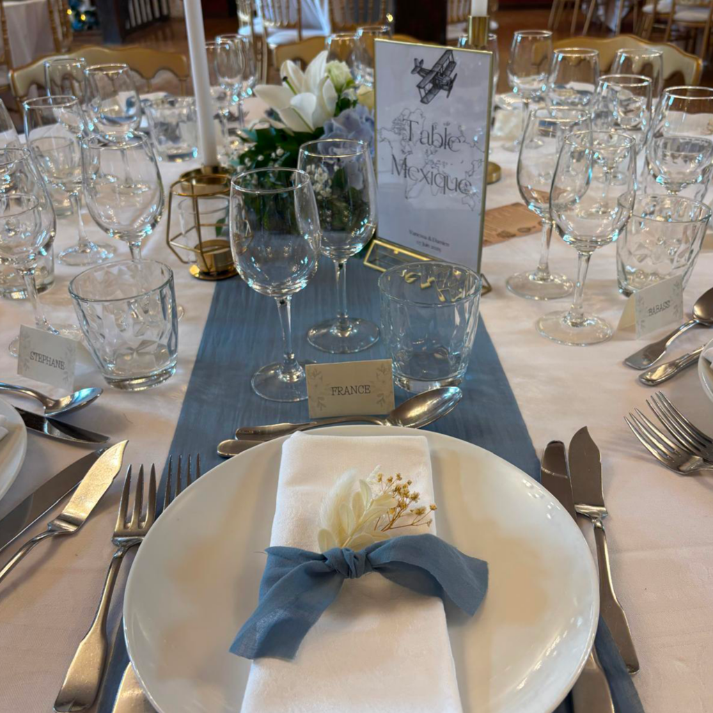 Ce mariage sur le thème du voyage, décliné en bleu, doré et marron, a été une véritable invitation à l’évasion. Élégant, chaleureux et profondément personnel, il reflétait parfaitement l’histoire des mariés.