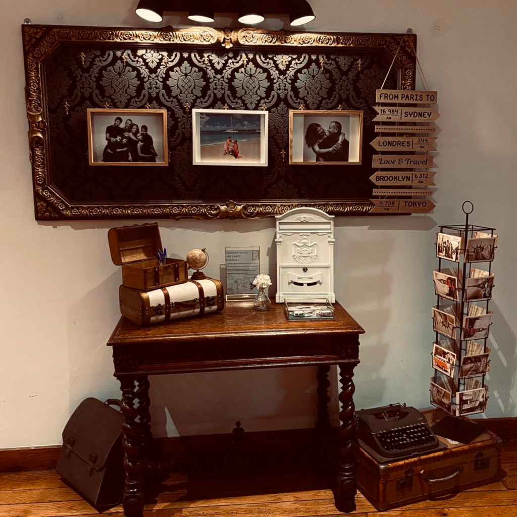Le livre d’or prenait la forme d’un carnet de voyage dans lequel chaque invité pouvait laisser un message, une anecdote ou un conseil pour les futurs mariés.