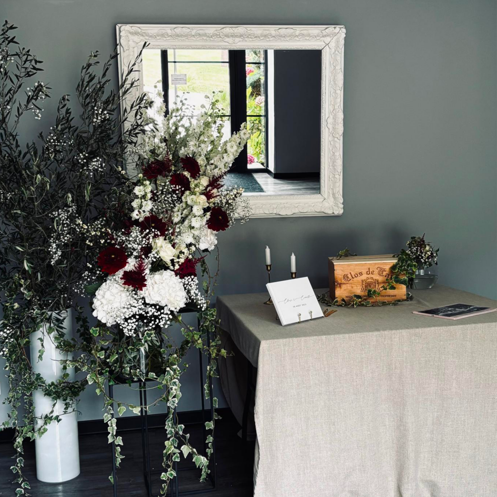 Récemment, j’ai eu le plaisir de concevoir la décoration complète d’un mariage autour de cet univers, dominé par des tons rouge profond, bordeaux et des matières naturelles comme le bois. Une scénographie immersive qui a transporté les invités au cœur d’un domaine viticole.